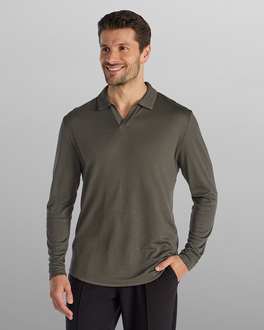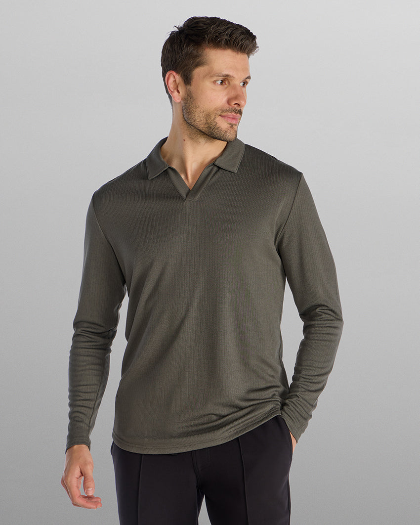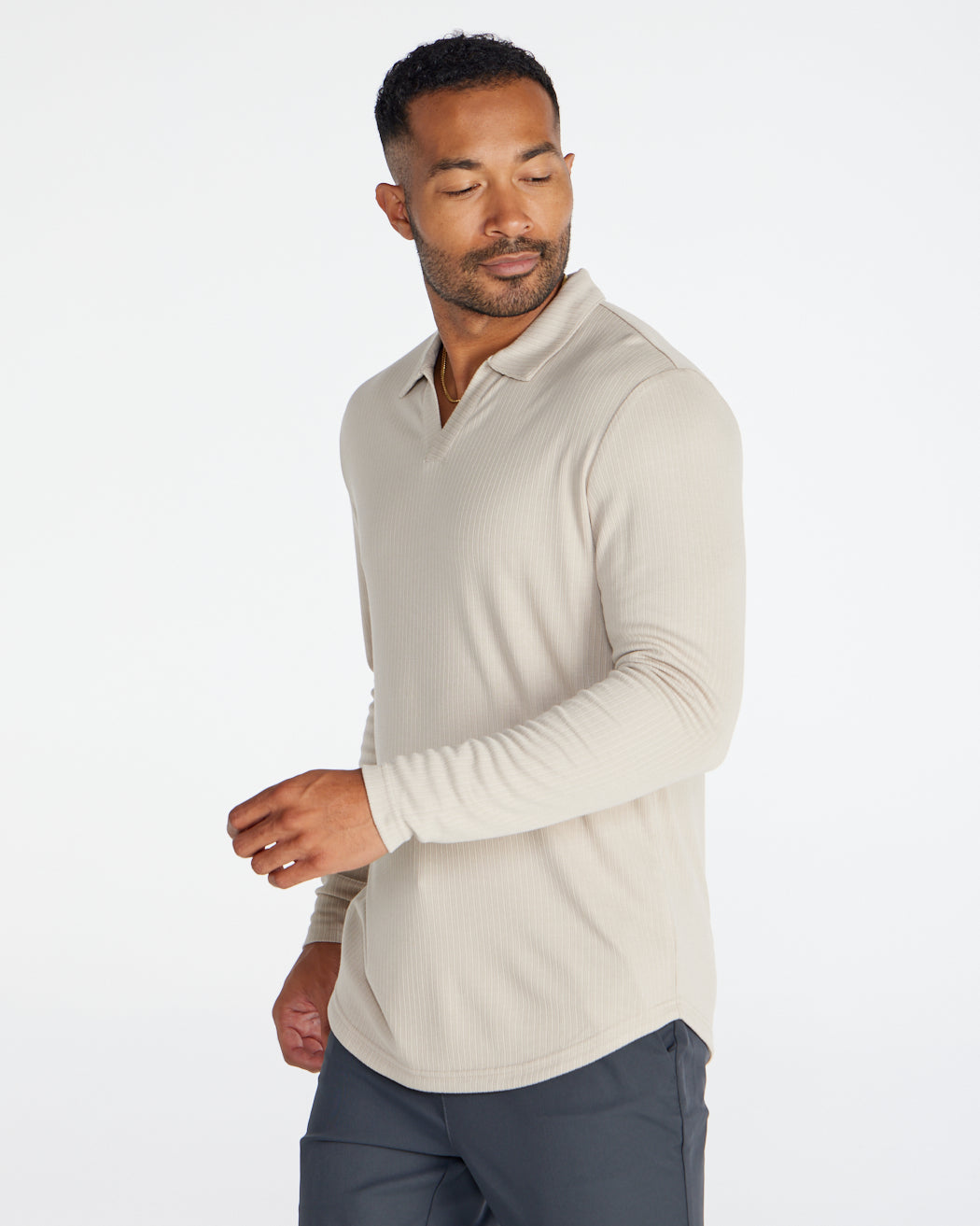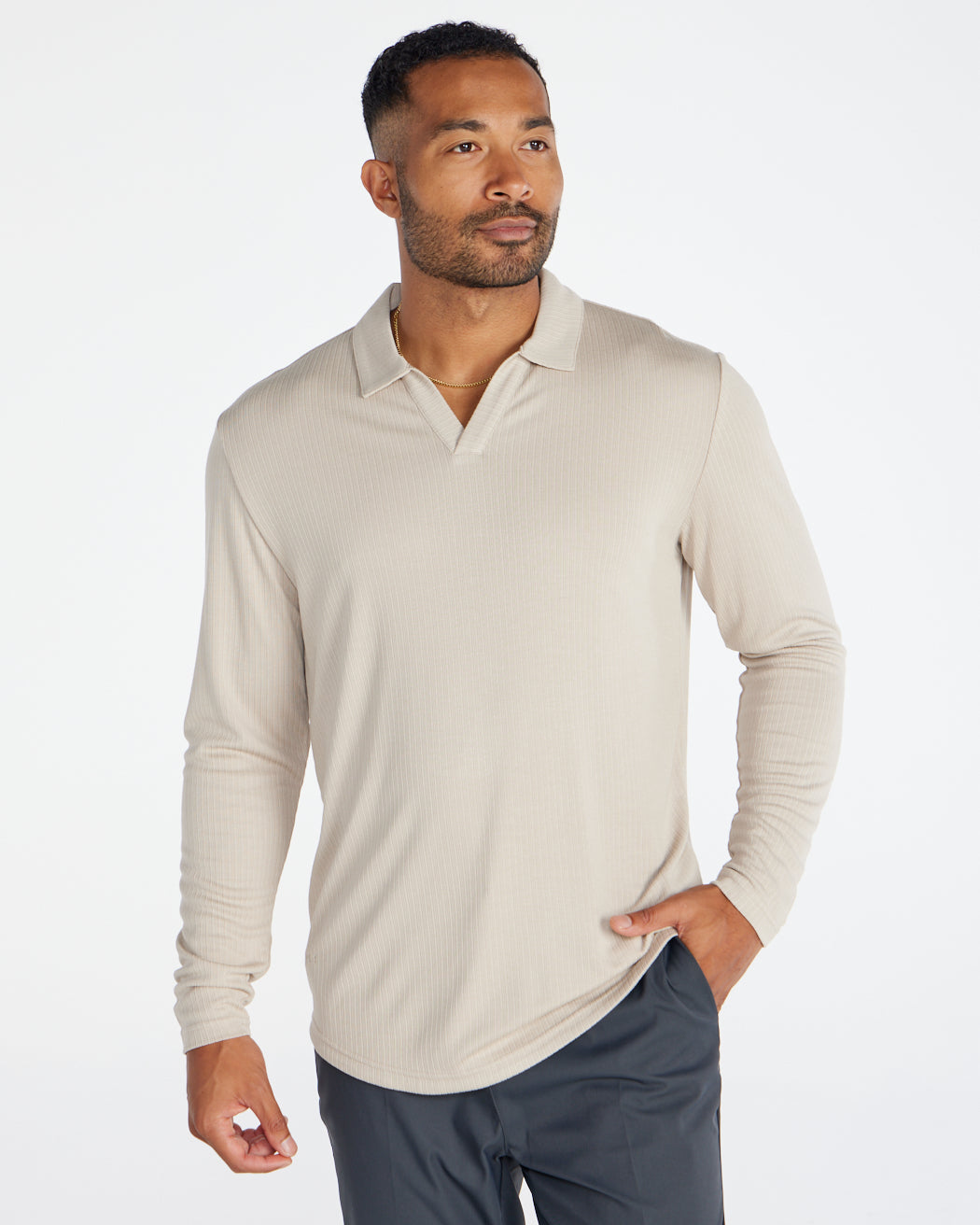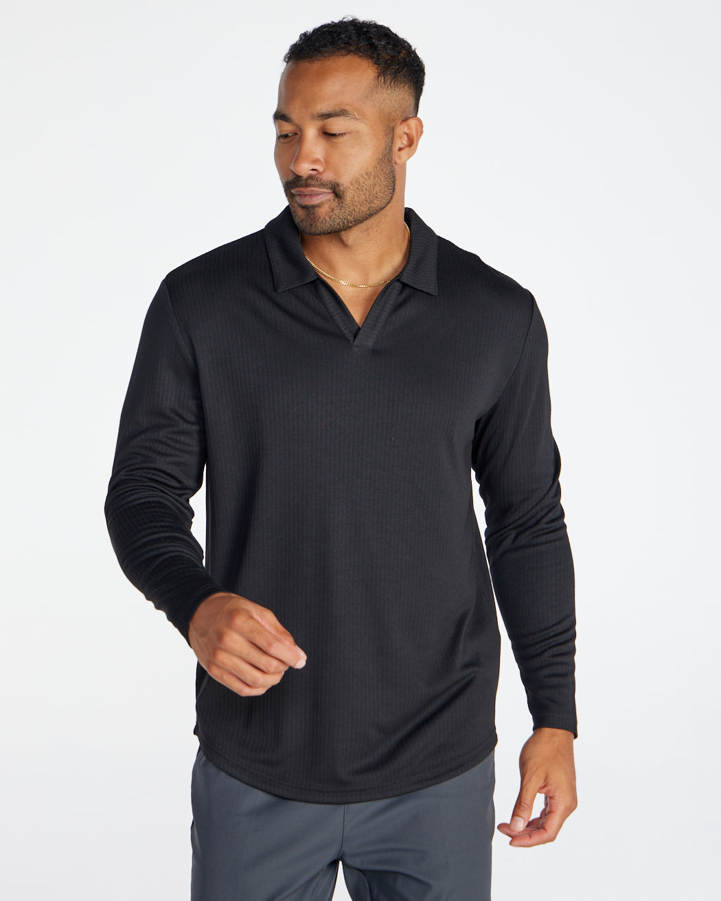 The Ribbed Open V Polo is now offered as a long sleeve. Crafted with a premium finish, embroidered branding, and lightweight stretch, it offers a soft-hand feel for all-day comfort. Ideal for a sharp, stylish look at social events, it ensures you make a lasting impression.